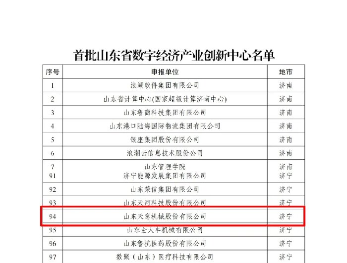 近日,省工信廳公布了首批山東省數(shù)字經(jīng)濟(jì)創(chuàng)新平臺(tái)名單,天意機(jī)械入選首批數(shù)字經(jīng)濟(jì)產(chǎn)業(yè)創(chuàng)新中心公示名單。